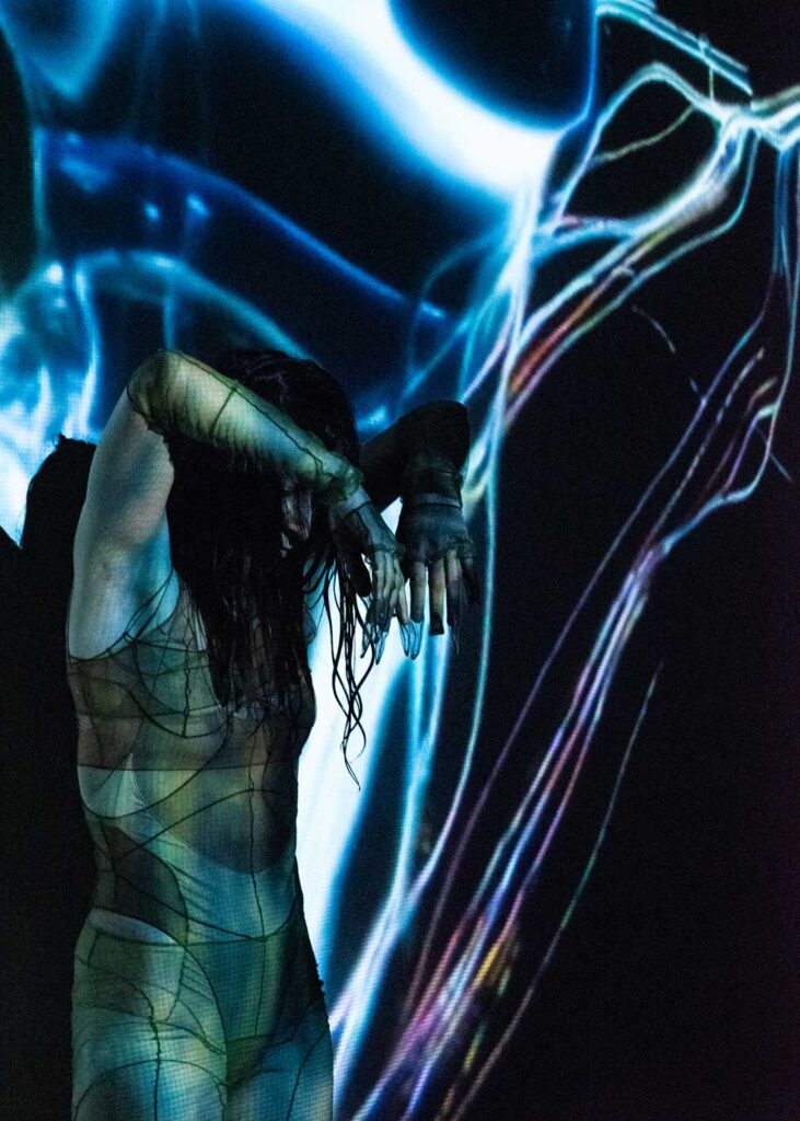 Seis performers en escena. Una coreografía registrada por sensores de profundidad y traducida en proyecciones envolventes. Cuerpos en Expansión transforma el movimiento en geometrías y destellos, generando una experiencia inmersiva donde lo visual y lo sonoro se sincronizan en tiempo real. Mora-Díaz trabaja con tecnologías interactivas para construir un lenguaje escénico hecho de luz y datos.