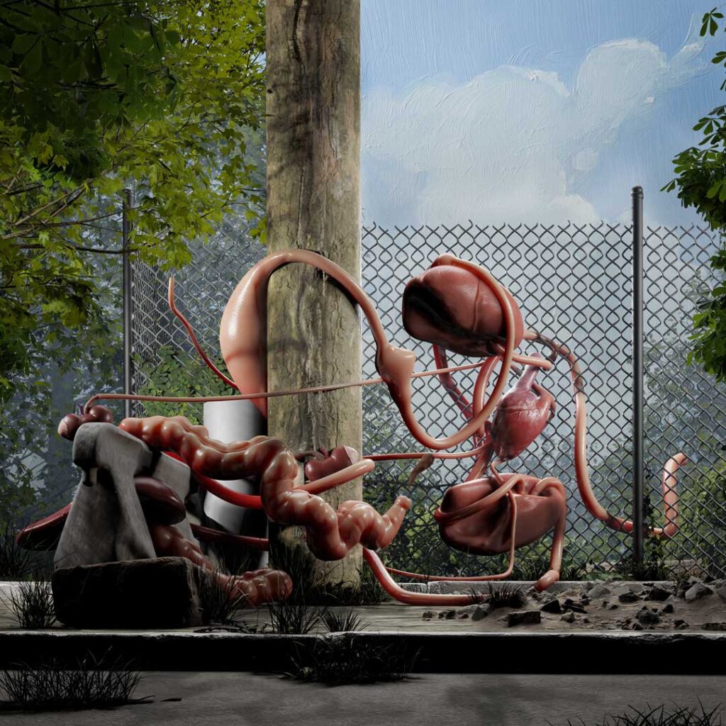 En La Cosa Extendida, Cristóbal Cea desarma al cuerpo y lo dispersa. Pulmones, corazones, órganos sin dueño flotan en una galería convertida en doble: física y digital, presente y ausente. La obra se instala en ese umbral donde la materia se mezcla con el código, donde las heridas personales se confunden con las fracturas históricas. Cea propone una anatomía mestiza, donde lo virtual no reemplaza lo real, sino que lo arrastra consigo.