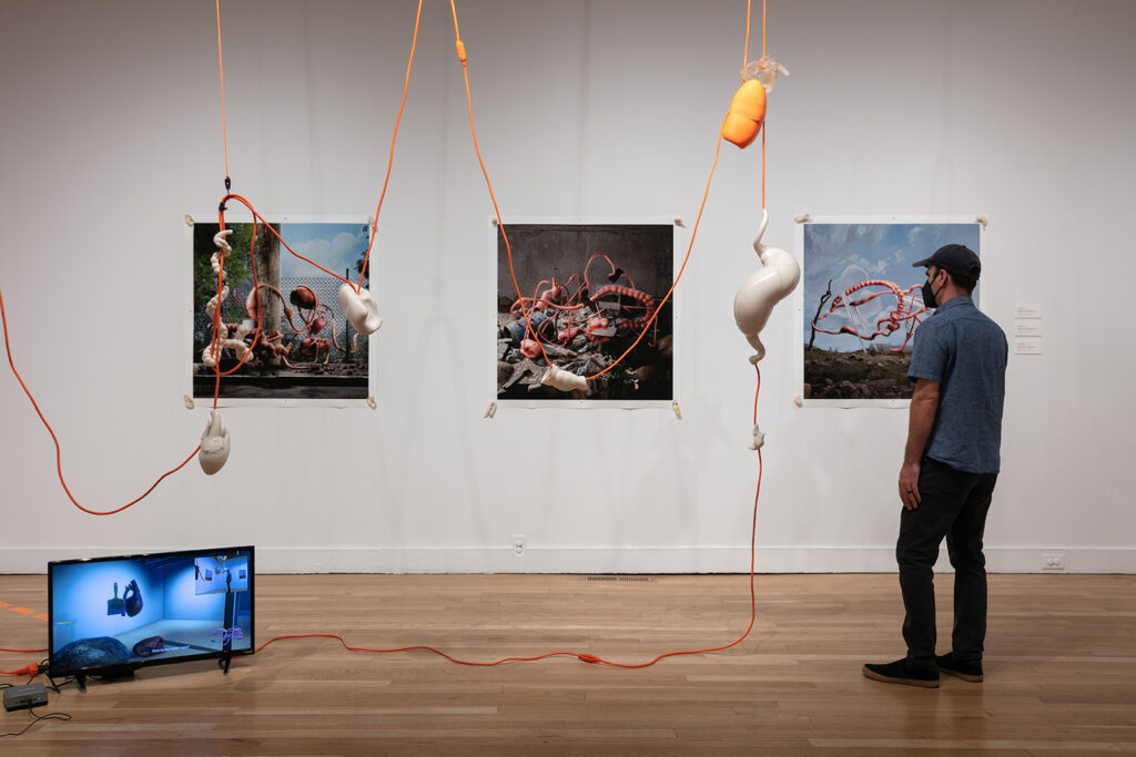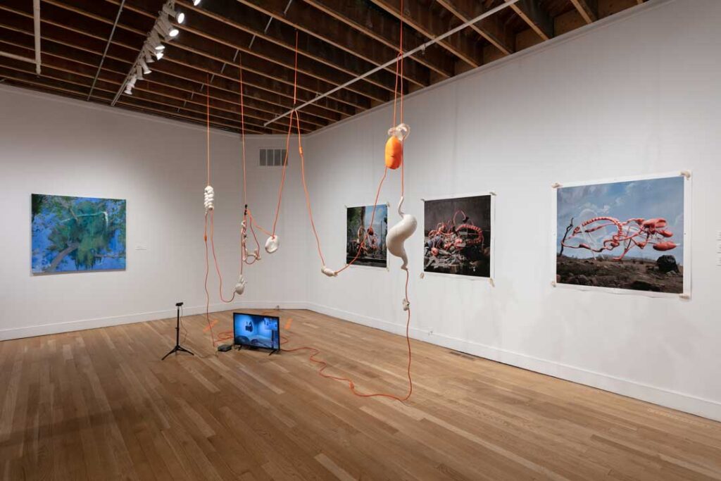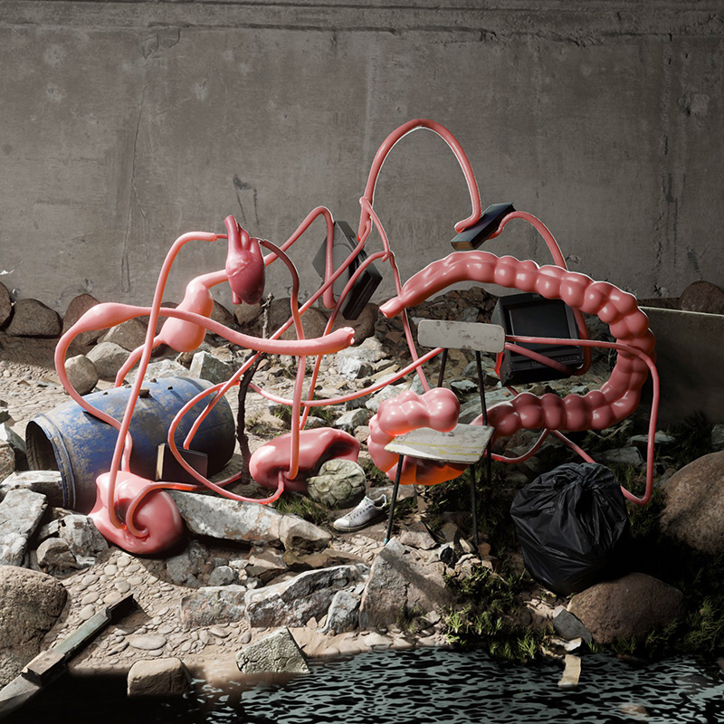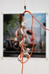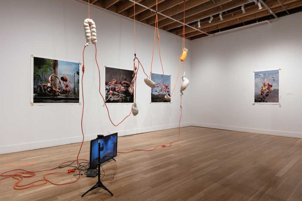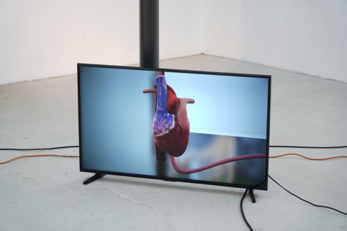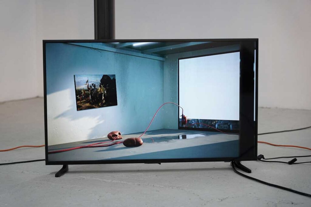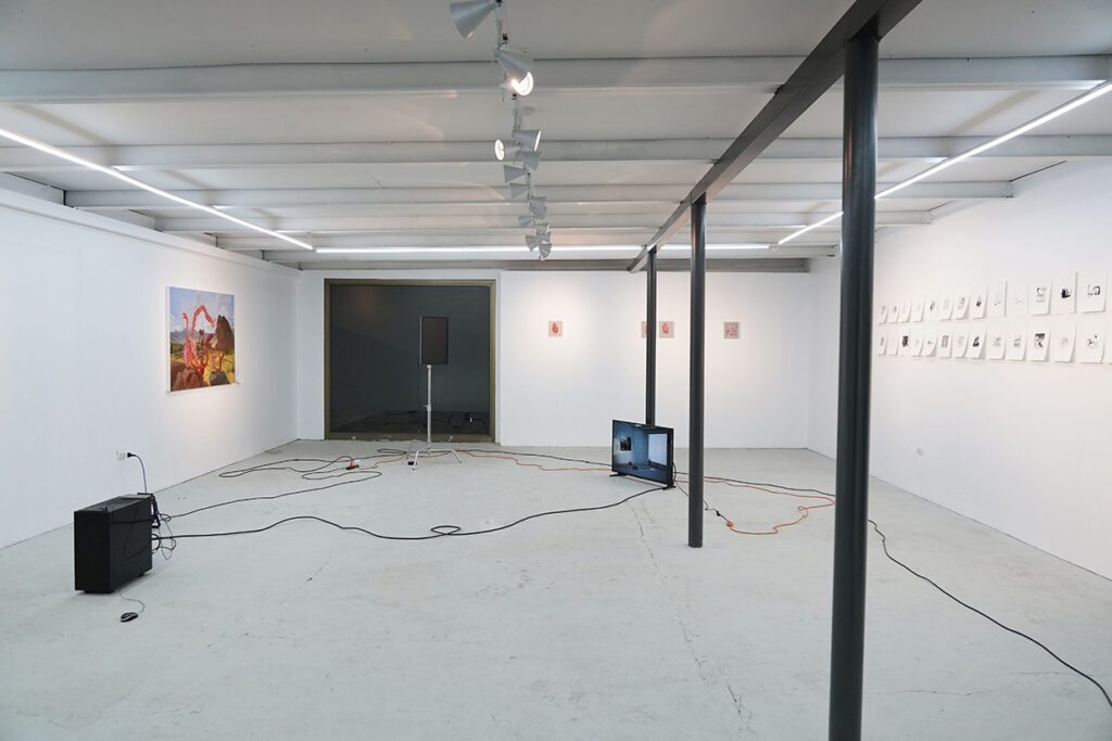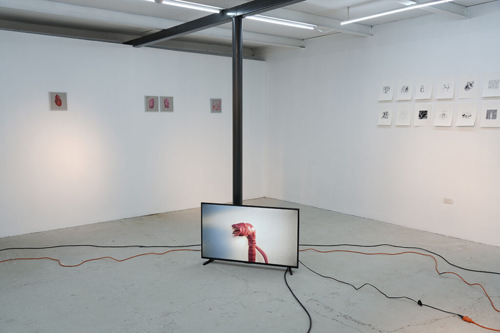 La Cosa Extendida es una exposición que habita el umbral entre lo físico y lo virtual. En ella, pulmones, corazones y restos de figuras históricas —como Simón Bolívar y Pedro de Valdivia— flotan entre pinturas, dibujos, cables y una réplica digital de la galería transmitida por streaming. Cea transforma el espacio expositivo en un laboratorio híbrido donde el cuerpo deja de ser unidad y se vuelve red: un organismo expandido, vigilado, persistente.