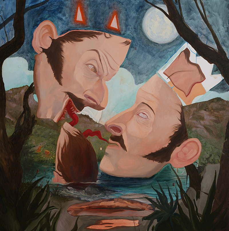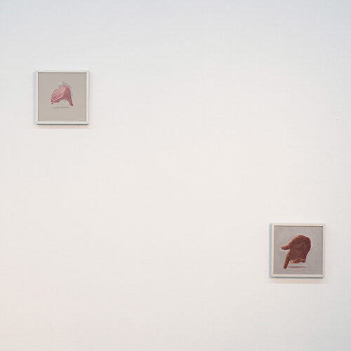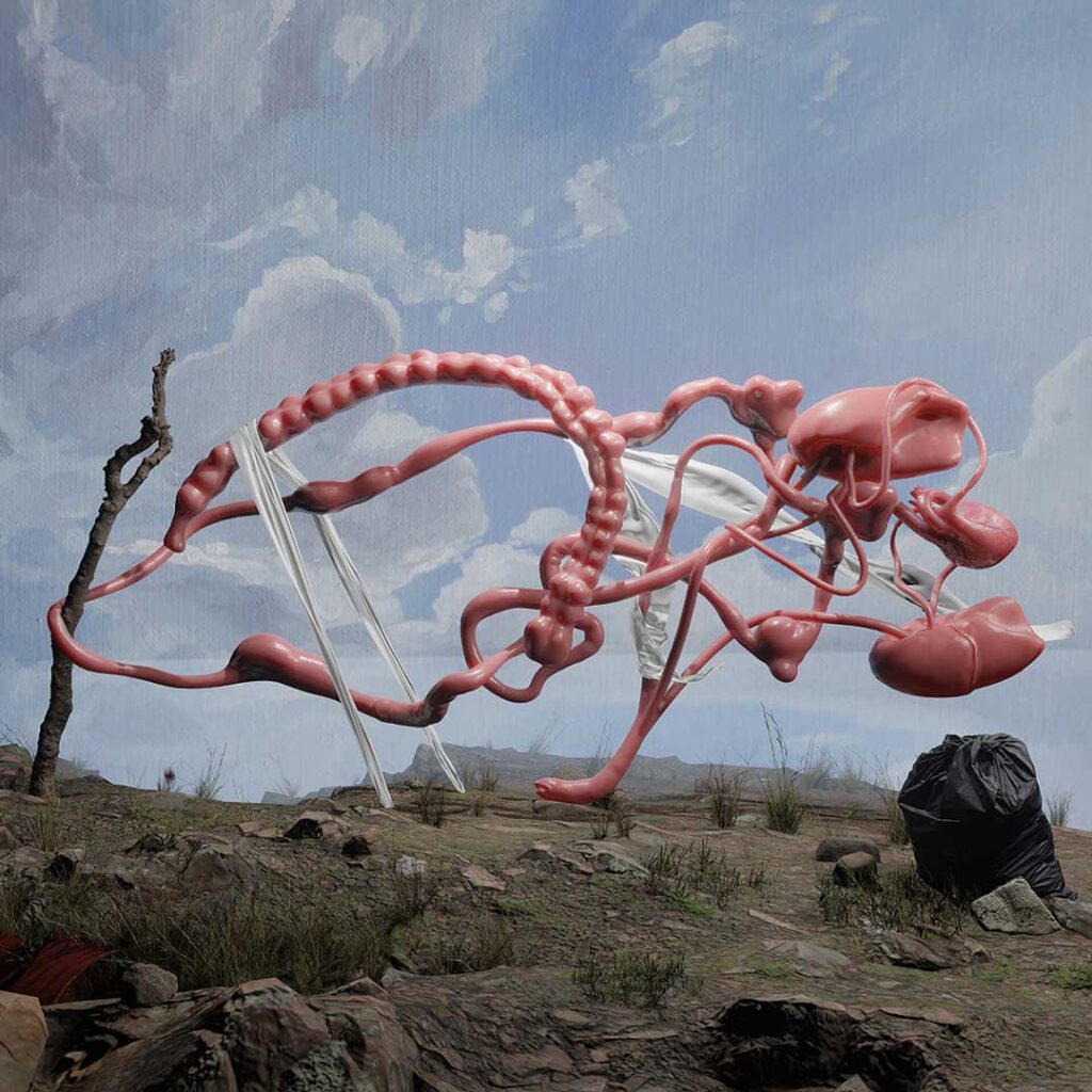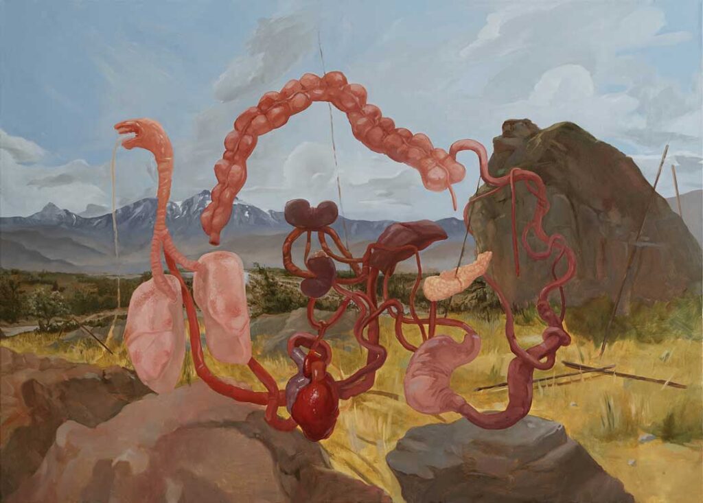 En paralelo, Cea reinterpreta La Fundación de Santiago de Pedro Lira, reemplazando a Pedro de Valdivia, a Inés de Suárez y a la hueste colonial por cuerpos fragmentados y órganos suspendidos. Pero mantiene un detalle: las manos del cuadro original. Una mano que señala “aquí” y otra que indica “allá”, como si la pintura misma dividiera el territorio, repartiendo lugares de dominio y exclusión. En la obra de Cea, esas manos ya no ordenan el mundo; apuntan a un espacio abierto, un escenario en el que la historia se descompone para volverse materia viva y disputada.