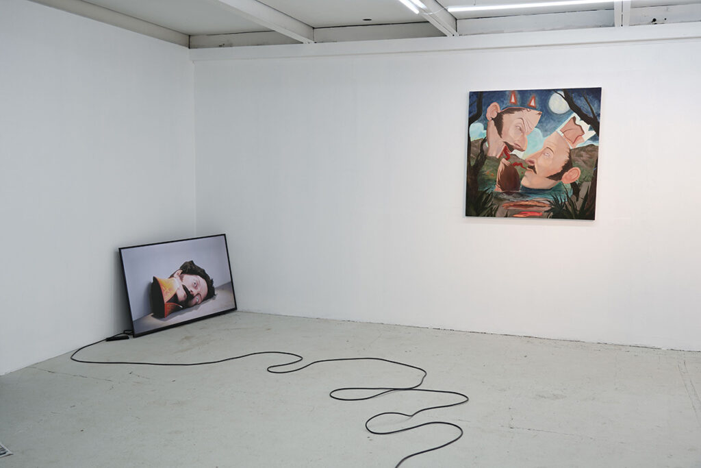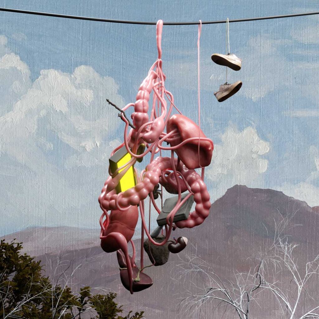 La Cosa Extendida es una muestra híbrida que habita simultáneamente el espacio físico y el digital. Reúne pinturas al óleo, dibujos hechos durante llamadas telefónicas en confinamiento, animaciones 3D y un “gemelo virtual” de la galería transmitido por streaming. En ella conviven órganos flotantes, mapas improbables del rostro de Simón Bolívar, y paisajes reimaginados de Pedro Lira sustituyendo conquistadores por cuerpos anónimos. Más que una simple suma de formatos, la exposición funciona como un sistema, un organismo expandido donde cada técnica —pincel, animación, videollamada— dialoga con las demás para cuestionar cómo se construye y fragmenta el cuerpo en la era digital.