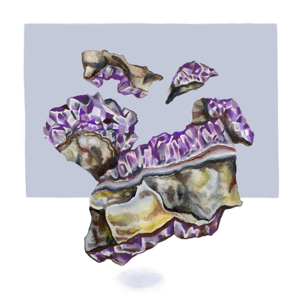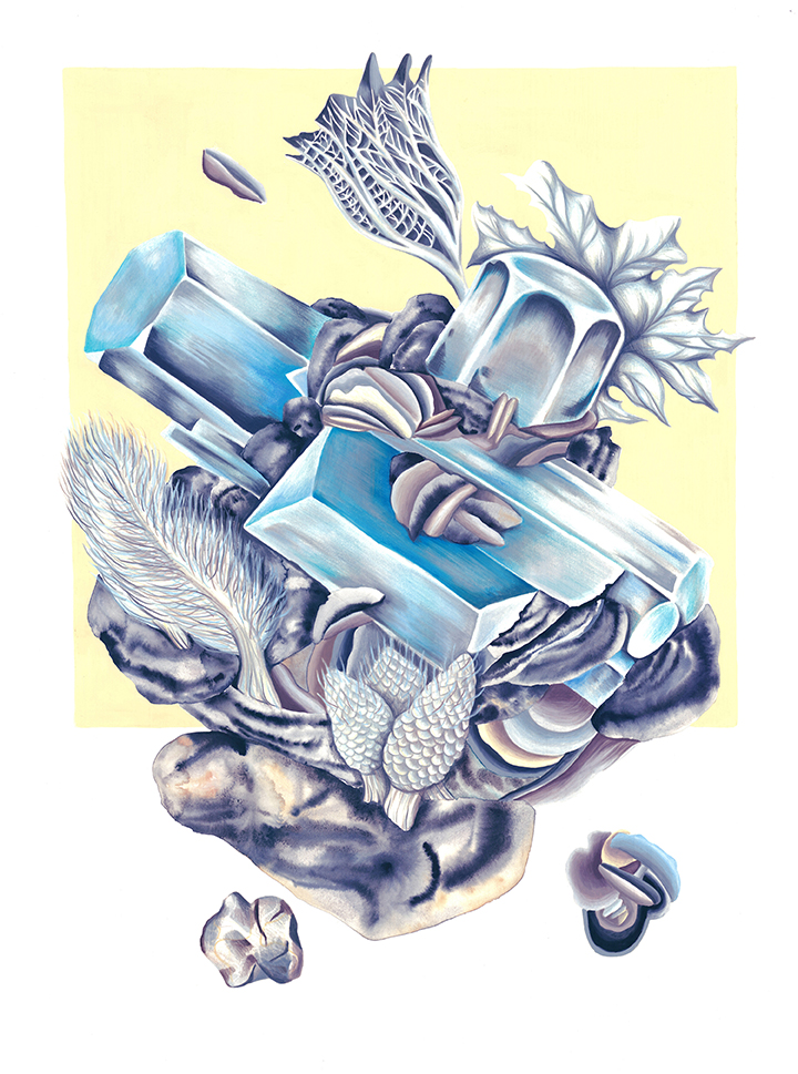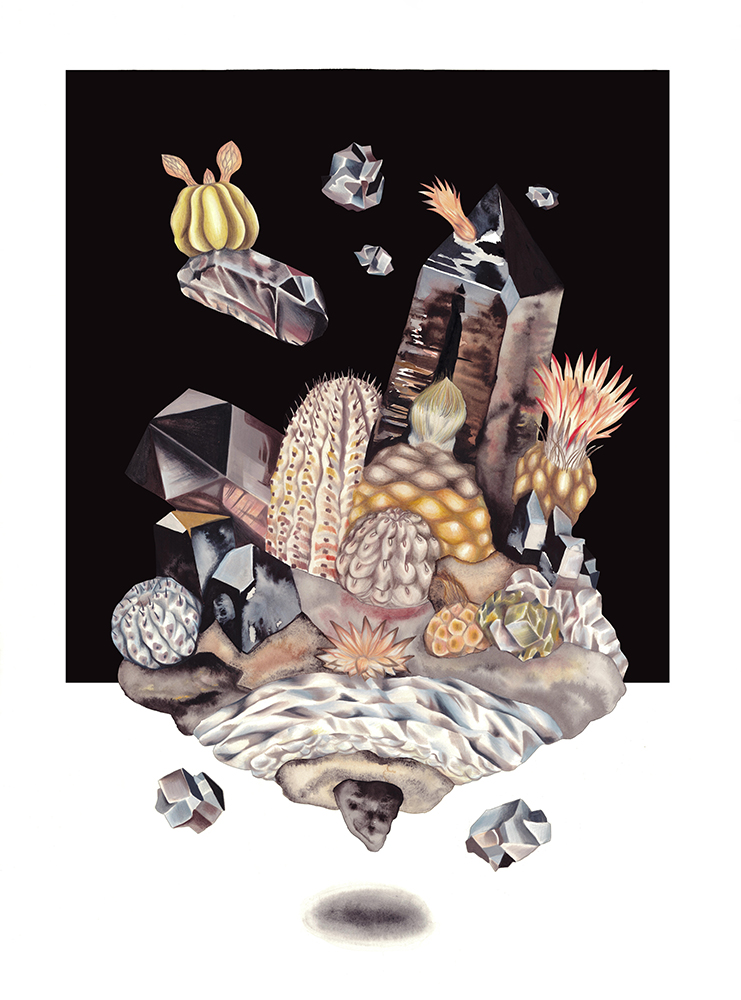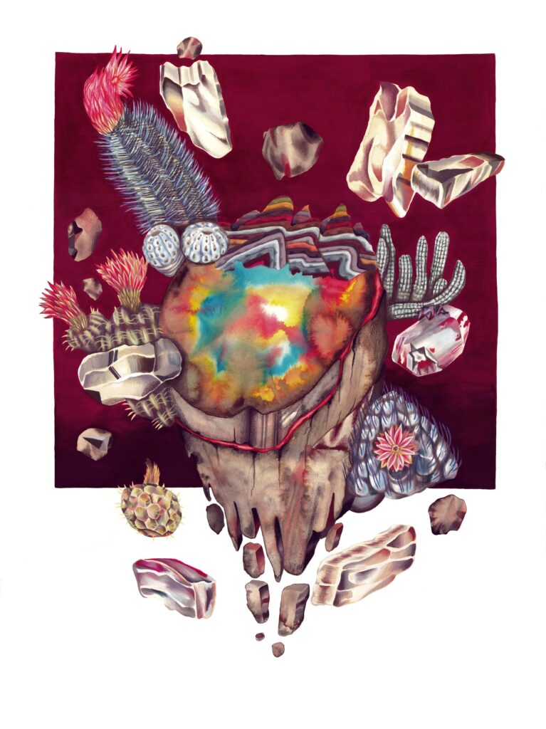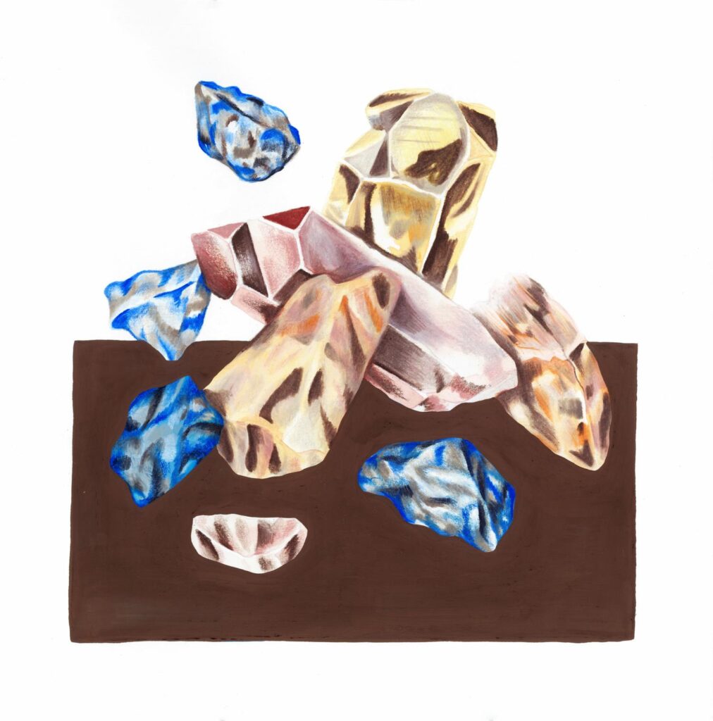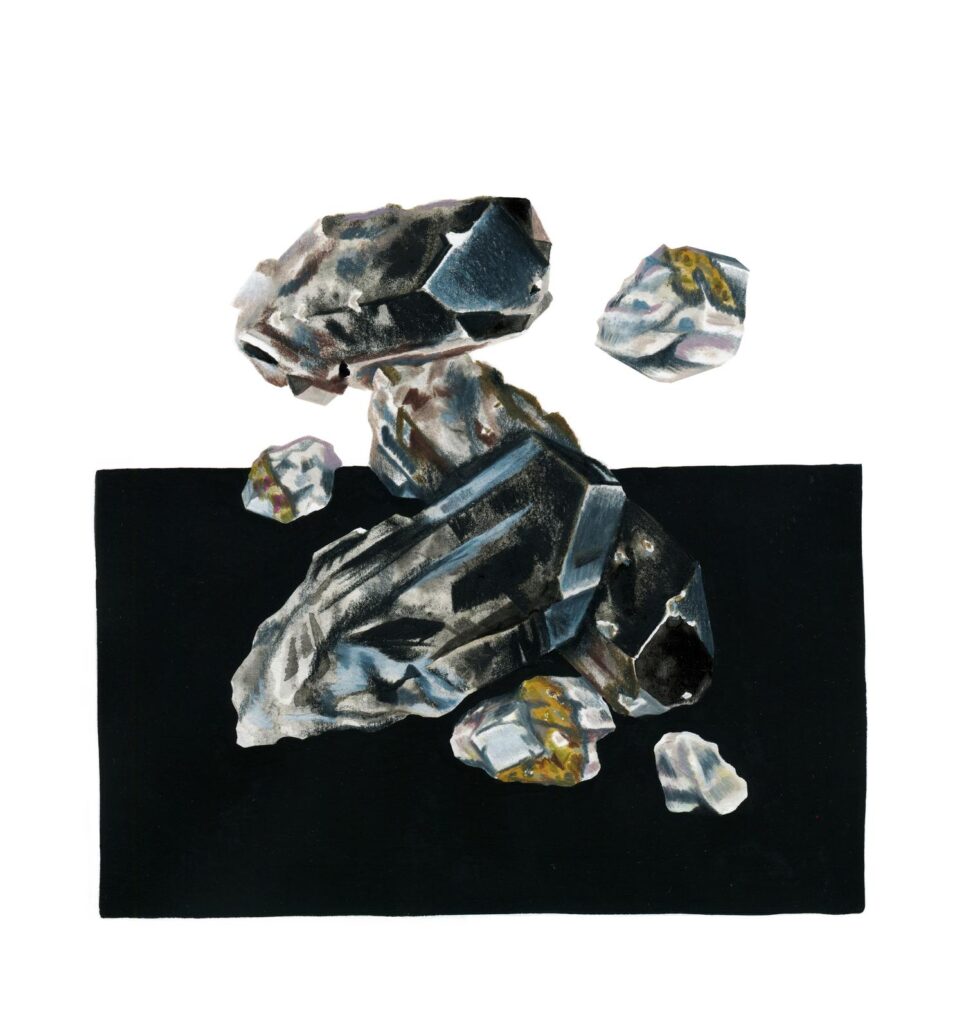 Las ilustraciones toman inspiración de paisajes concretos y afectivos: Pan de Azúcar, Caldera, el desierto de Atacama y su floración efímera, el valle del Elqui, Chuquicamata y Licancabur en Chile; junto a montañas de su vida en Suiza como el Cervin, el Salève y el Eiger. A este mapa se suman estudios de cristales —combapirita, quartzuri, crisocoma, malacooper, amatista y pirita ahumada— que expanden la investigación hacia una mineralogía especulativa. En esta constelación de lugares y minerales, Mountopia ensaya una lectura de la montaña como paisaje micelial: múltiple, interconectado, en transformación constante.