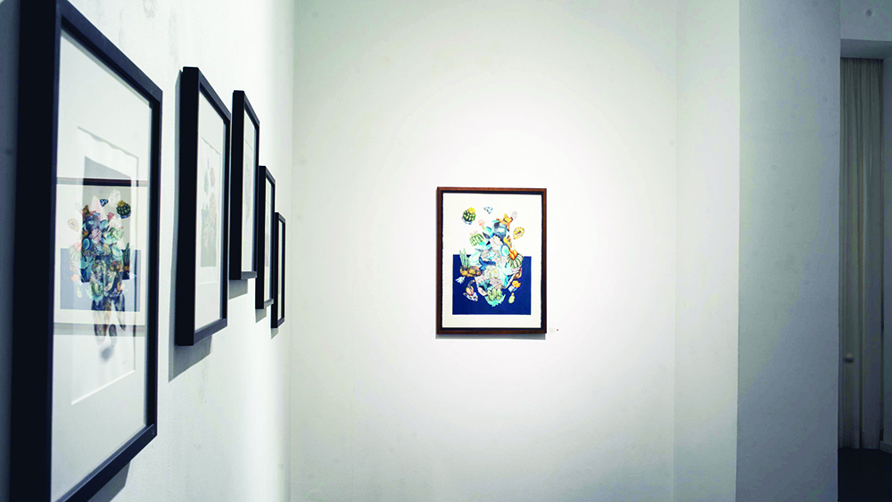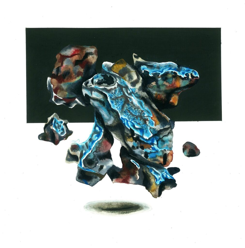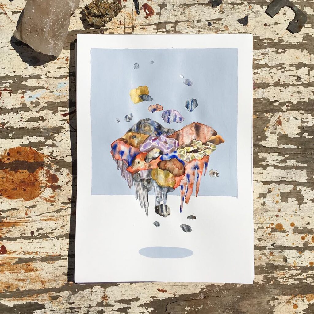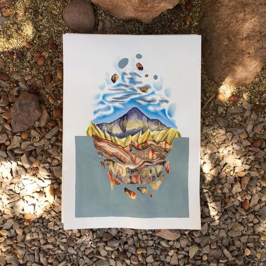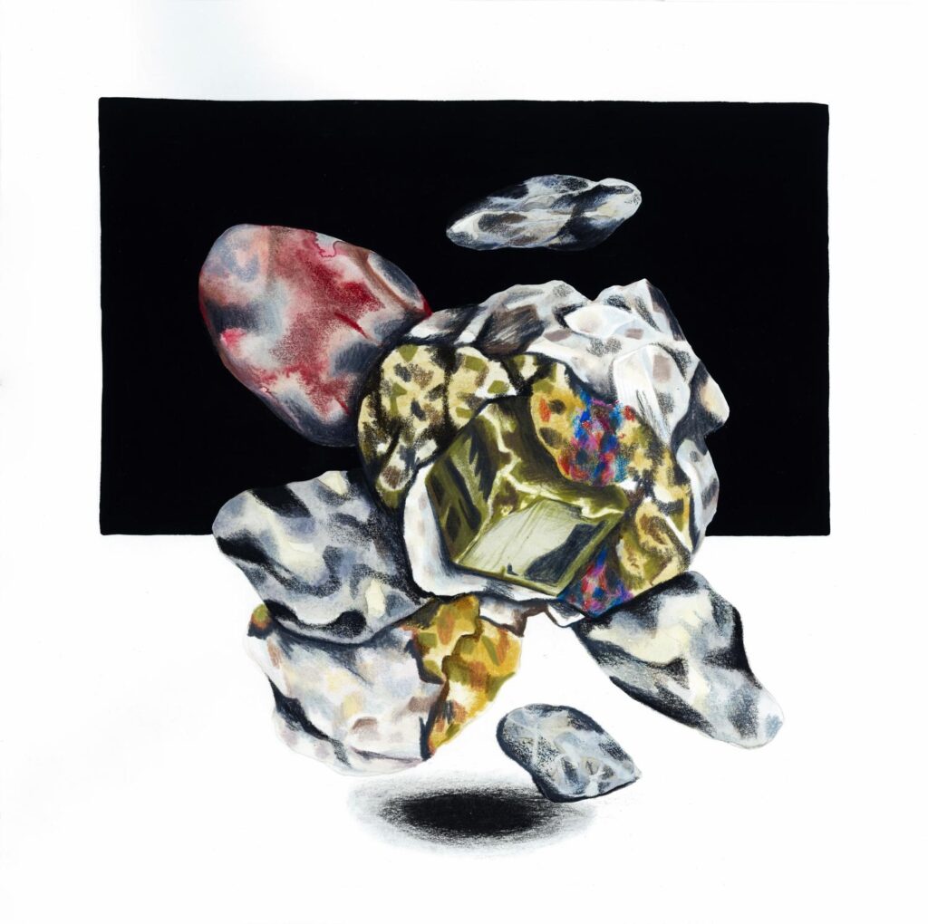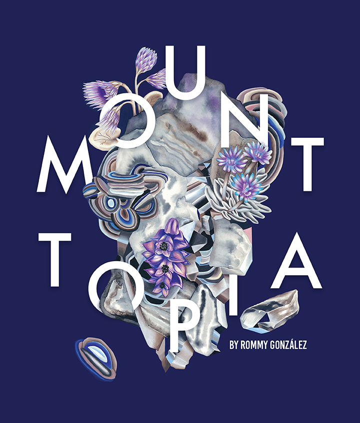 Mountopia de Rommy González cuestiona la montaña como emblema de lo monumental y lo eterno. Sus dibujos y acuarelas fragmentan la cordillera, descomponiéndola en estratos que se reorganizan en paisajes abstractos. En este gesto, lo geológico deja de ser bloque inmóvil para convertirse en un territorio en transformación, donde minerales y vegetación se entrelazan en composiciones que multiplican lo visible.