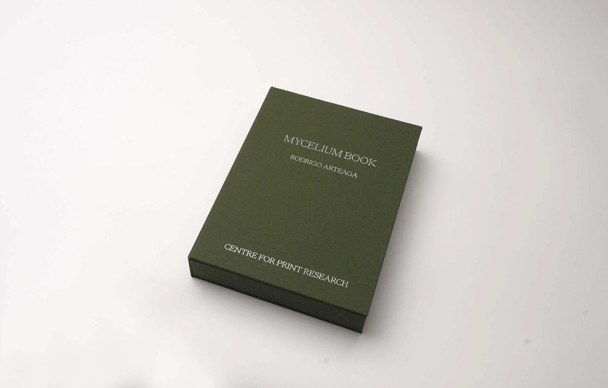 Mycelium Book de Rodrigo Arteaga surge como un libro expandido, un objeto que no busca fijar un relato sino abrirlo en múltiples direcciones. Concebido durante una residencia en el Centre for Print Research de la University of the West of England (UWE) en Bristol, la obra transforma la lógica editorial en un terreno experimental: entre microscopios, placas de petri, agar y caminatas por el bosque, cada fragmento se convierte en huella de un proceso más que en obra acabada.