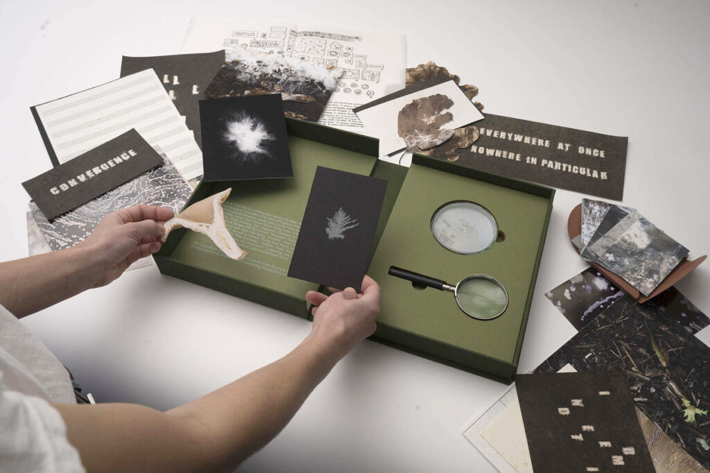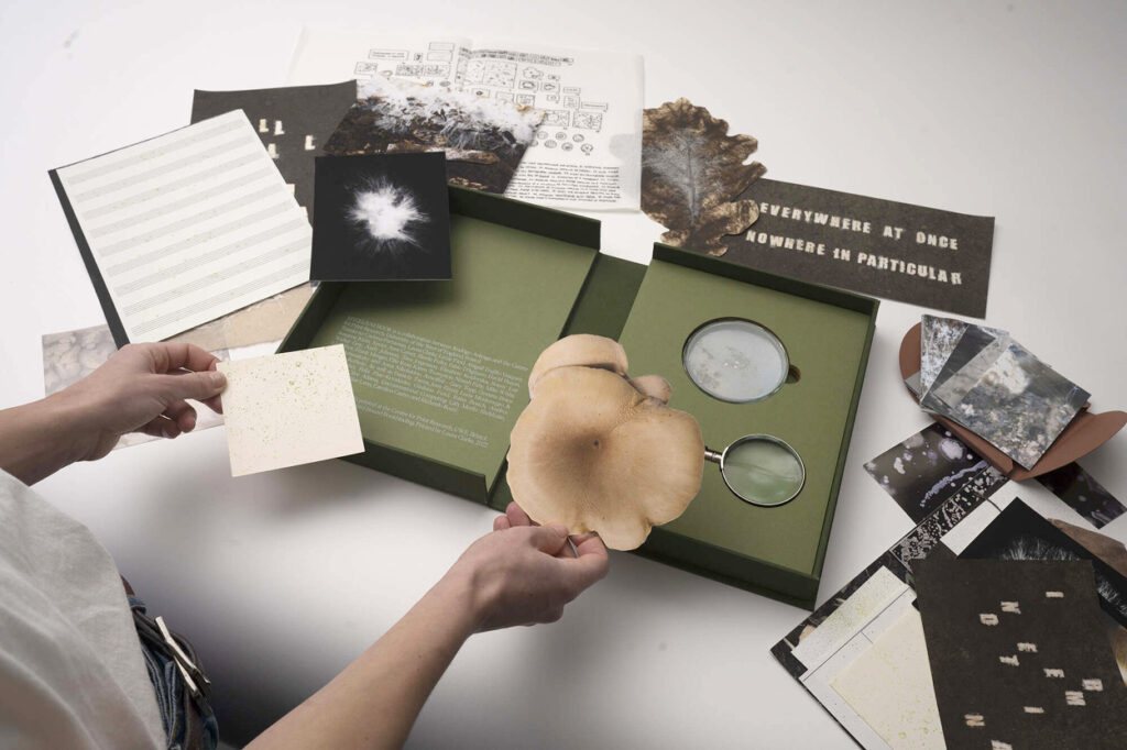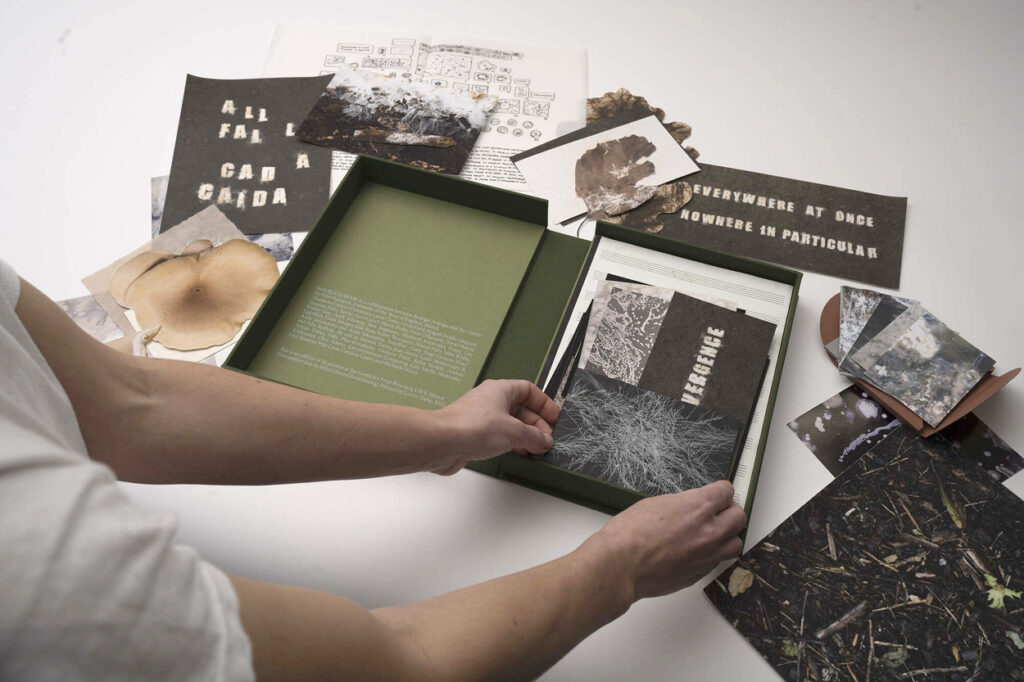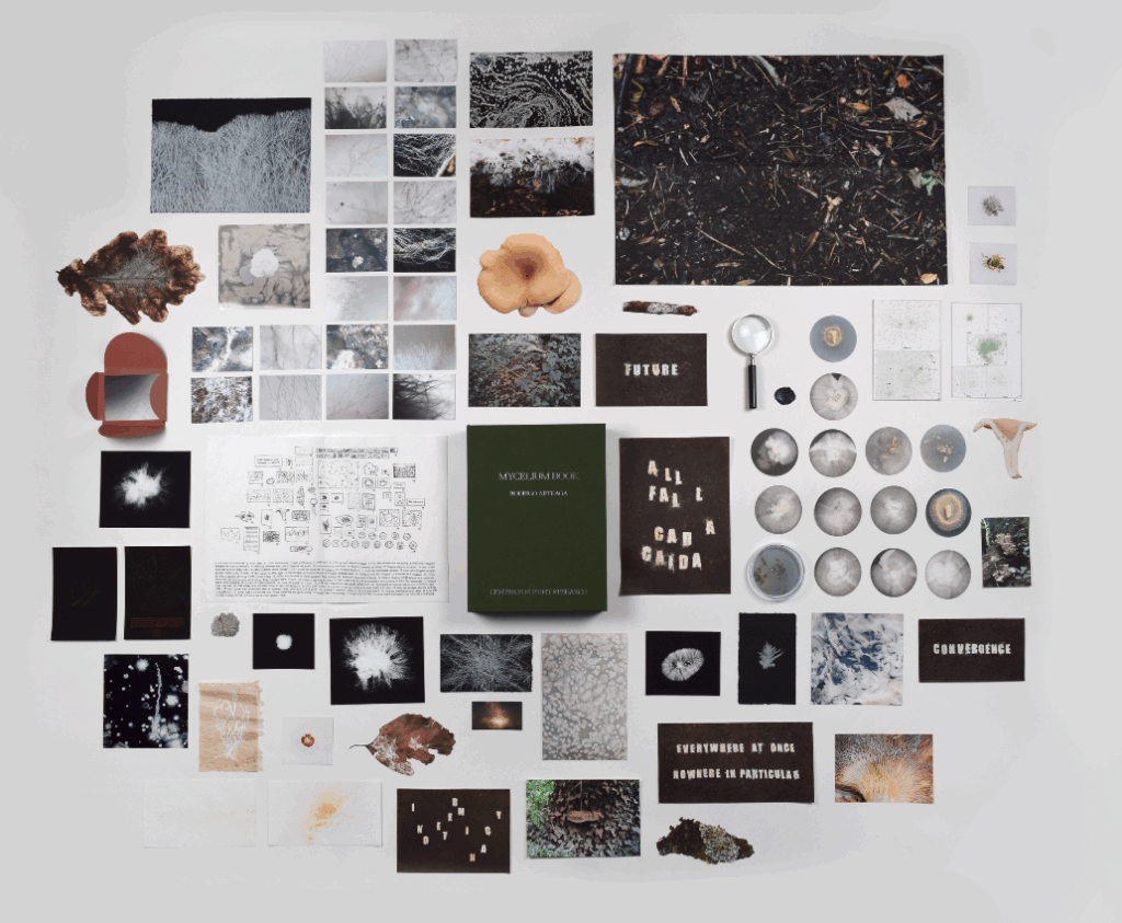 El resultado es un libro-caja que se despliega como un archivo vivo: impresiones, fragmentos y objetos que funcionan como invitaciones a seguir un proceso abierto más que como colecciones cerradas. Como el suelo que guarda y transforma, Mycelium Book propone una lectura donde cada página es un umbral, cada huella una señal de lo que se expande y se transforma bajo la superficie.