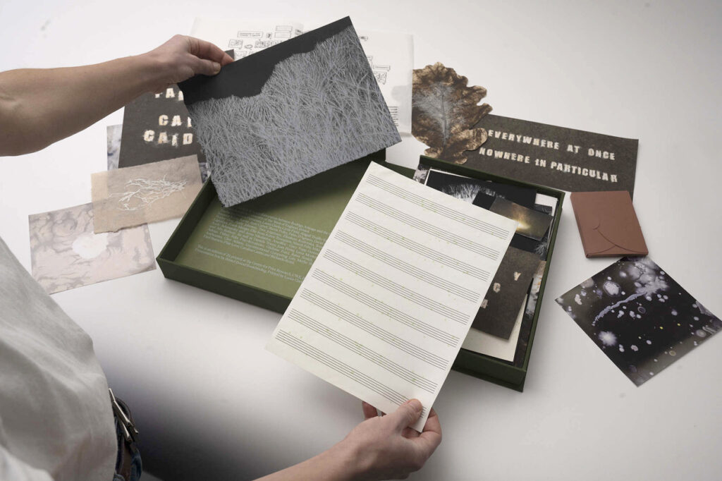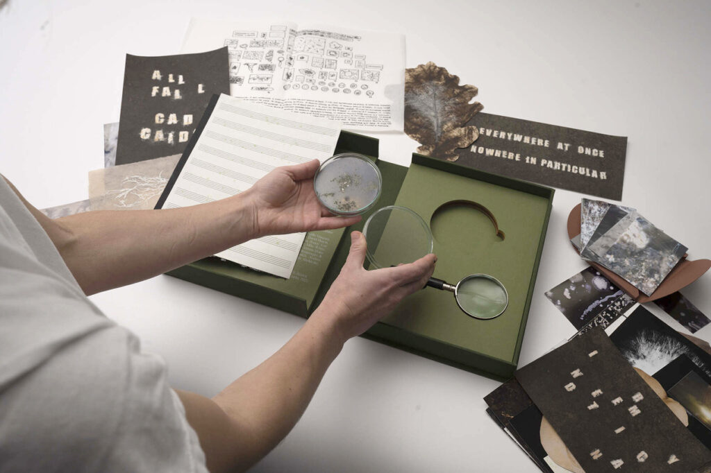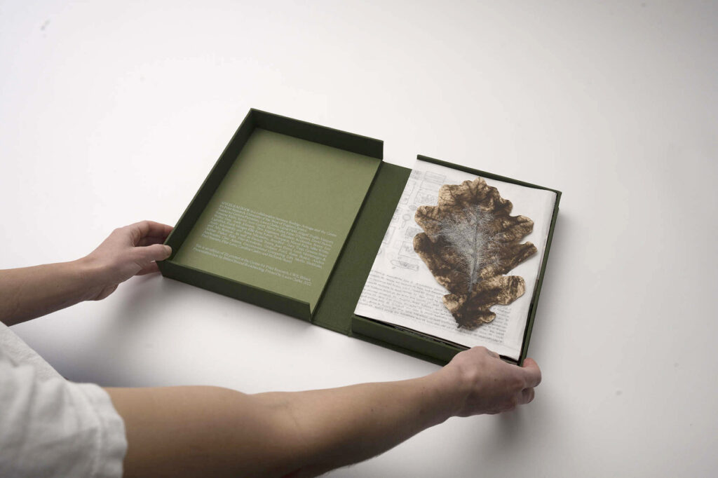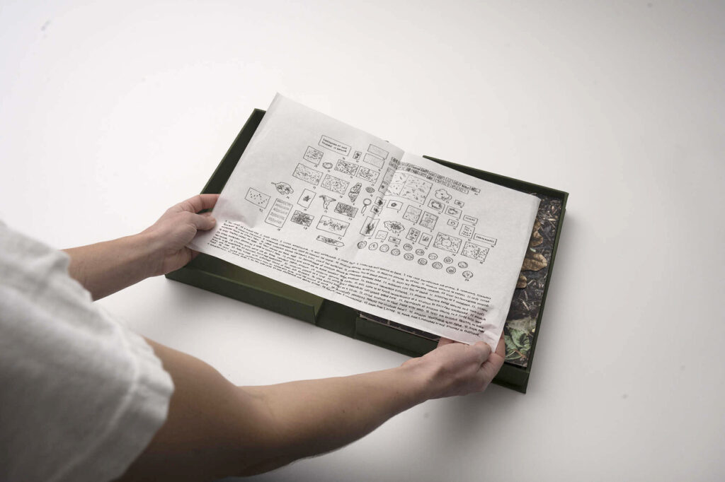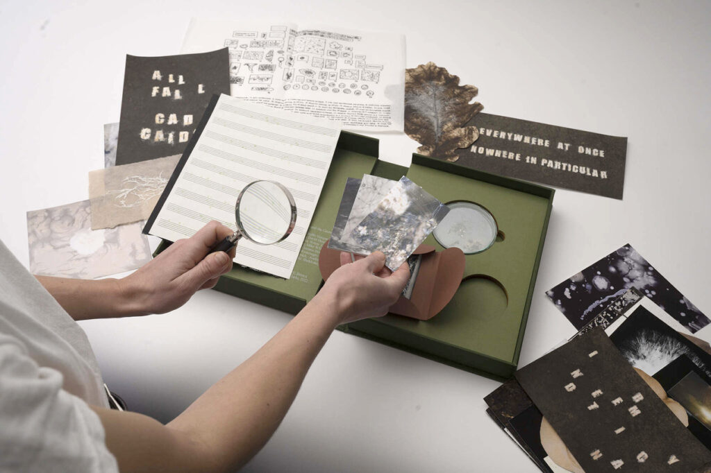 El resultado es un libro-caja que se despliega como un archivo vivo: impresiones, fragmentos y objetos que funcionan como invitaciones a seguir un proceso abierto más que como colecciones cerradas. Como el suelo que guarda y transforma, Mycelium Book propone una lectura donde cada página es un umbral, cada huella una señal de lo que se expande y se transforma bajo la superficie.