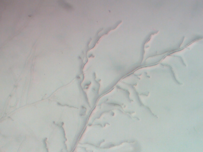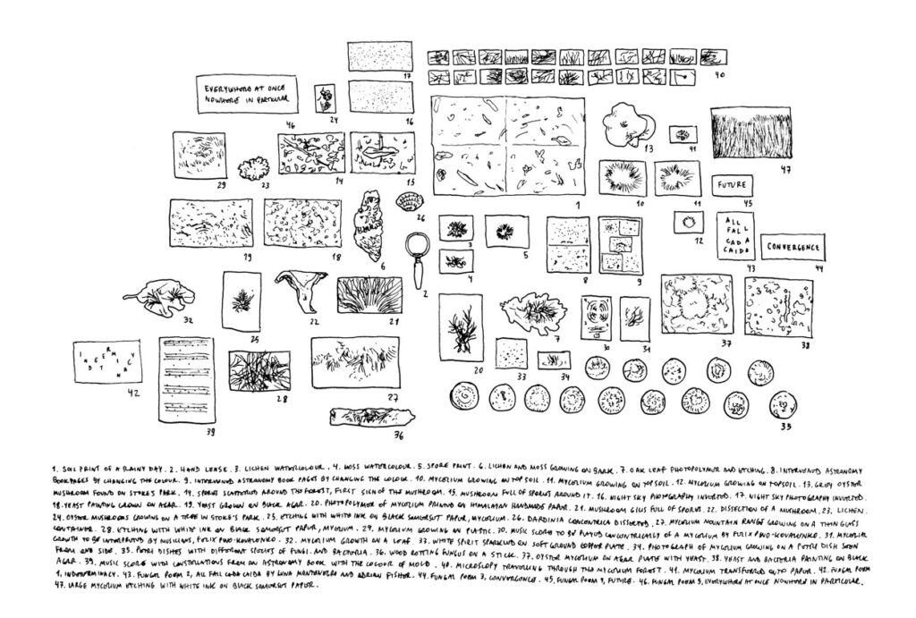 En su desarrollo, Mycelium Book incorpora técnicas diversas: grabados que reproducen redes observadas al microscopio, placas fotosensibles expuestas directamente al micelio, letras de madera inoculadas con Pleurotus ostreatus (champiñón ostra) para escribir “poemas fúngicos”. Cada procedimiento es a la vez dispositivo de observación y gesto de colaboración con los hongos, donde la materia se convierte en trazo y el tiempo en inscripción.