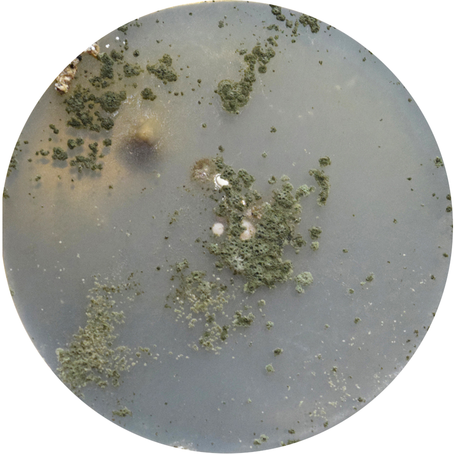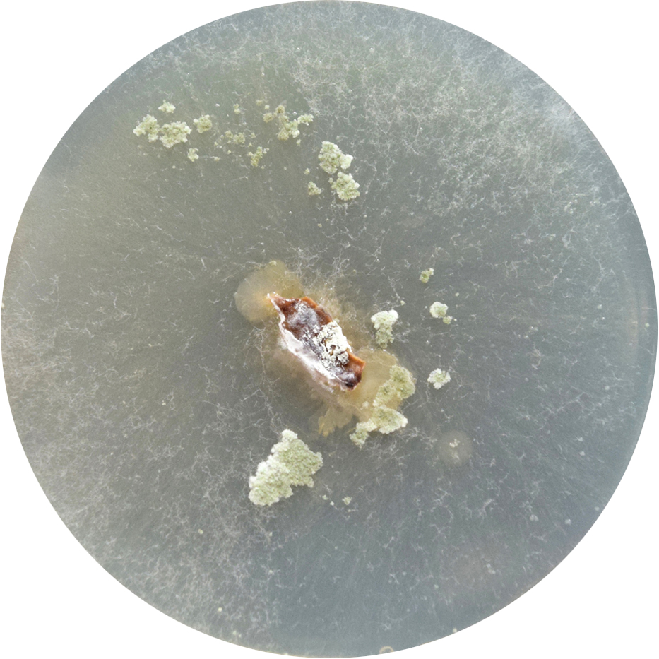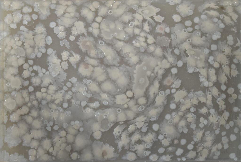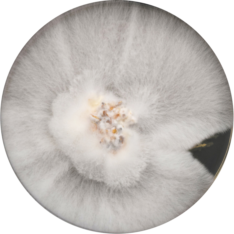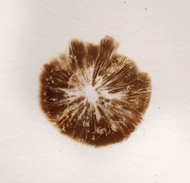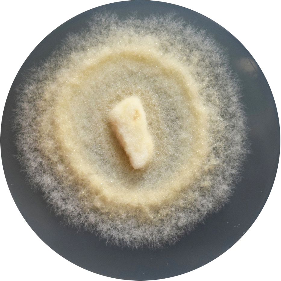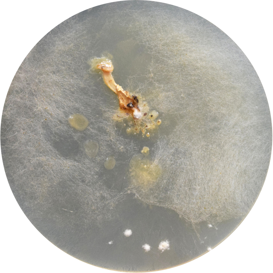 • Placa de Petri de vidrio (9 cm de diámetro) con 14 impresiones de micelio cortadas digitalmente sobre papel Somerset Book.
