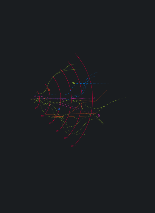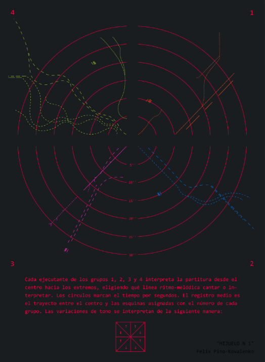 Cada ejecutante de los grupos 1, 2, 3 y 4 interpreta la partitura desde el centro hacia los extremos, eligiendo qué línea ritmo-melódica cantar o interpretar. Los círculos marcan el tiempo por segundos. El registro medio es el trayecto entre el centro y las esquinas asignadas con el número de cada grupo. Las variaciones de tono se interpretan de la siguiente manera: