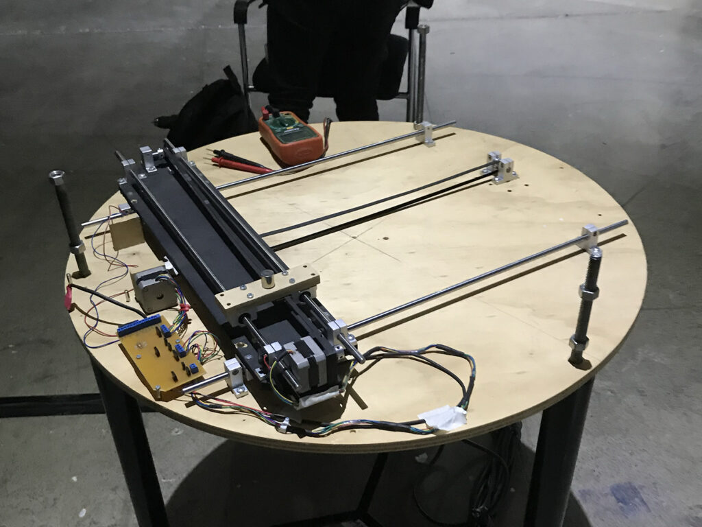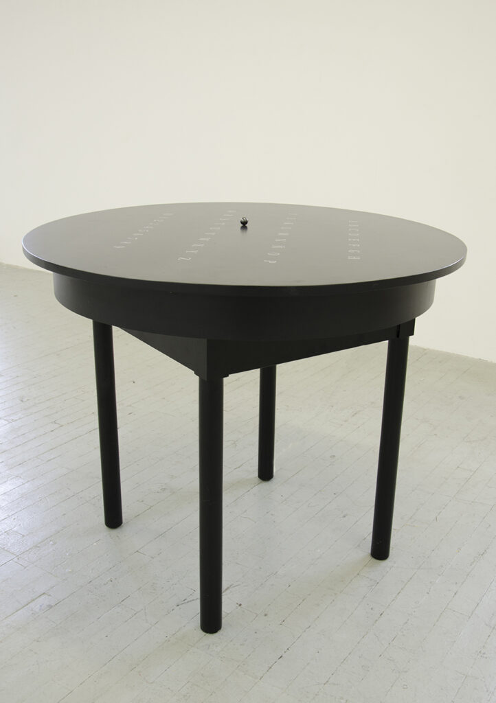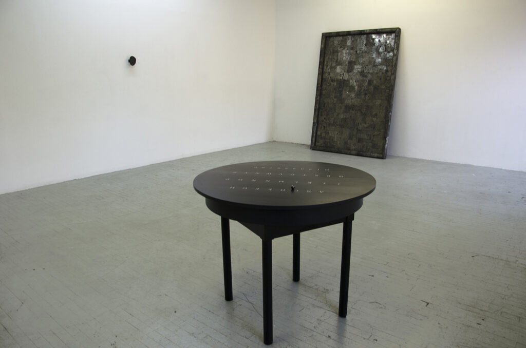 Construida con materiales de alta conductividad; cobre, níquel, oro y magnetita, Ouija (Tierras Raras) convierte un tablero espiritista en un cuerpo electromecánico en perpetua escritura. Motores ocultos bajo la madera mueven lentamente la planchette, componiendo oraciones que aparecen sobre una hoja blanca sin mediación humana. El mecanismo, alimentado por algoritmos y motores de búsqueda, opera como un oráculo digital: un flujo de palabras que surgen del ruido informacional, como mensajes dictados por una inteligencia sin cuerpo.
