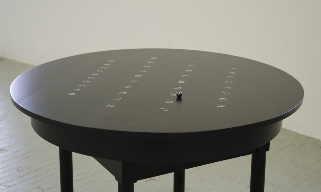 El dispositivo encarna una paradoja contemporánea: una ouija sin espíritu que, sin embargo, no deja de producir espectros. Prieto activa la ilusión de lo animado, desplazando el mito decimonónico del médium hacia el territorio de la inteligencia artificial. Su mesa invoca la pregunta por el alma de la máquina, eco del viejo “fantasma en la máquina” que Gilbert Ryle y Alan Turing situaron entre filosofía, psique y cálculo. Así, Ouija no evoca a los muertos, sino a los sistemas invisibles que ya piensan y escriben por nosotros.