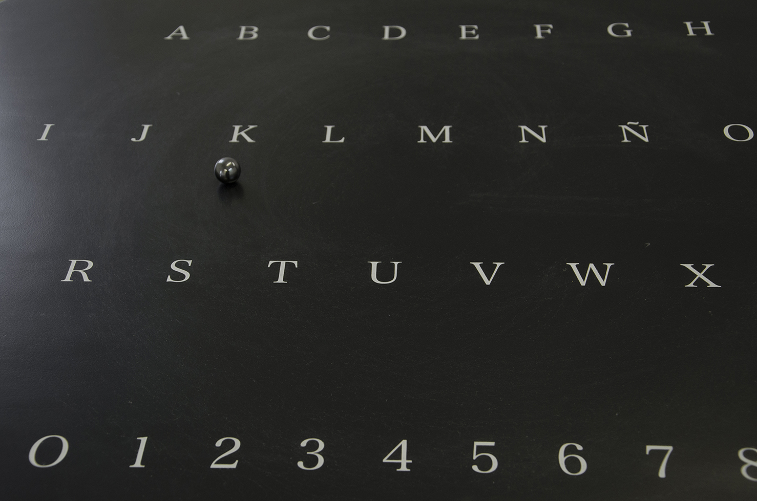 En Ouija (Tierras Raras), Prieto crea un tablero espiritista que, bajo su superficie de madera, motores, imanes y algoritmos reemplazan a las manos humanas, convirtiendo el acto de invocar en una operación de código. Cada frase que emerge fue extraída de la red, mediante motores de búsqueda que traducen palabras como “fantasma”, “máquina” o “obsceno” en oraciones recopiladas al azar. Lo que se manifiesta no proviene del más allá, sino del más acá: del inconsciente colectivo digital que hoy responde a nuestras preguntas antes de que las formulemos.
